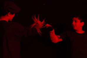 Ein Schwarzlichtstück mit selbstgebauten Klappmaulpuppen: Wovon träumen die unscheinbaren Würmer? Davon, einmal im Rampenlicht zu stehen! Doch wer im Licht steht ist auch für den gefräßigen Großen Vogel sichtbar. Zusammenarbeit mit Malerei (Amelie von Stenglin), Musik (Akinola Famson) und Groß-Figurenbau (Shona Thinius), 5. Klasse, Liebmann-Förderschule. Für diese KInder waren die Klappmaulfiguren genau das Richtige! Sprechen mit den Händen, Sprechen mit dem Mund - beides zugleich auch noch!